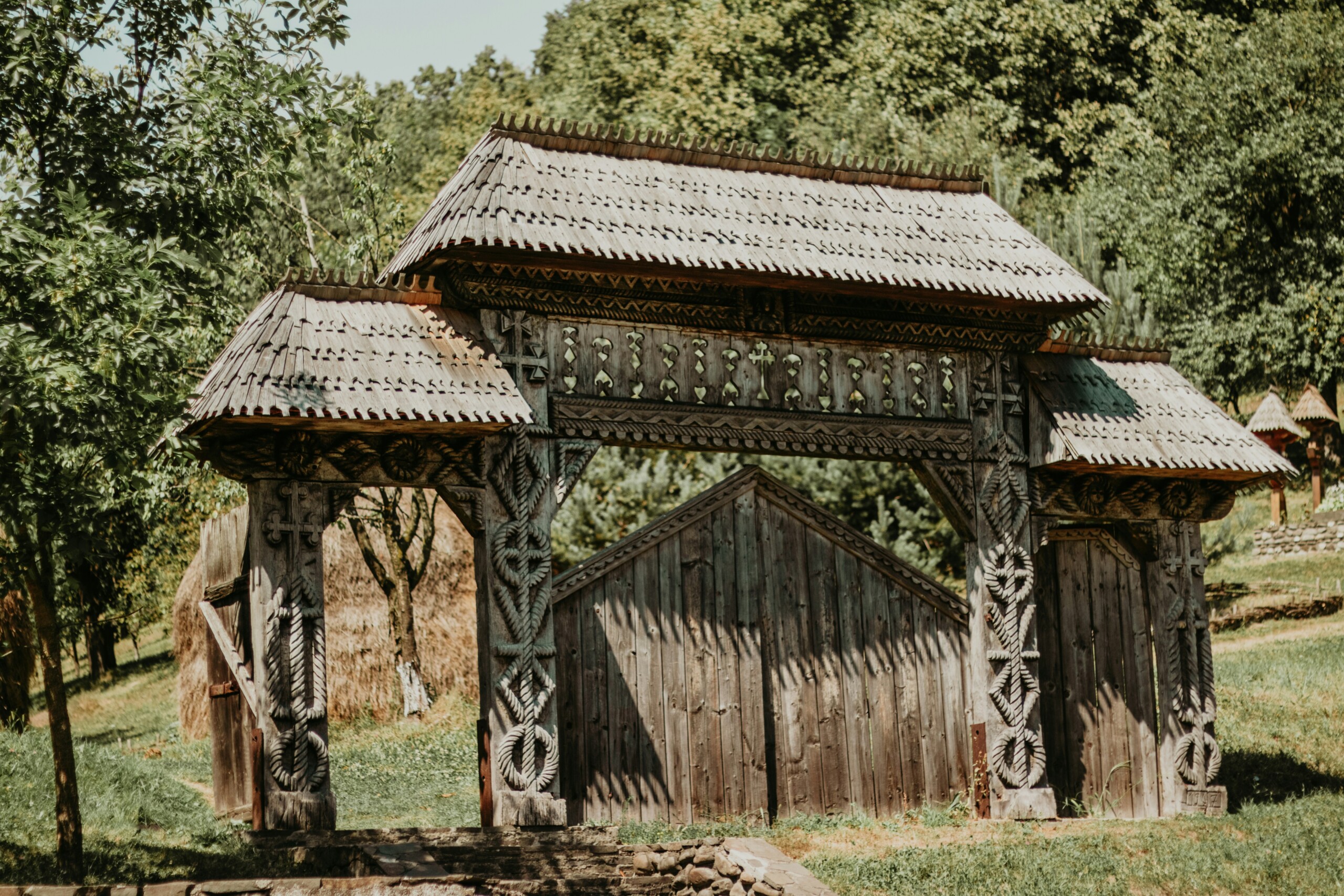Porțile din lemn sculptate manual sunt unul dintre cele mai recognoscibile simboluri ale Maramureșului. Ele nu sunt doar decorative, ci au rol protector și spiritual. Modelele sculptate – funia, soarele, frunza – au semnificații vechi, transmise din generație în generație.